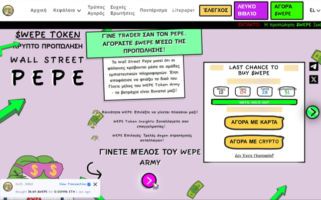 Το Wall Street Pepe είναι ένα meme coin που συνδυάζει τη δημοτικότητα των meme με την κουλτούρα της Wall Street.Το έργο διαθέτει μια ενεργή και αφοσιωμένη κοινότητα που προωθεί το έργο. Στόχο του είναι να βοηθήσει όλους τους κατόχους του token, παρέχοντάς τους έγκυρες επενδυτικές στρατηγικές και συμβουλές. Μάλιστα, με την προπώληση του έργου να σπάει κάθε ρεκόρ, η άνοδος στην τιμή του $WEPE αναμένεται να είναι αρκετά μεγάλη.