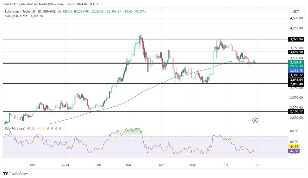 At the time of writing, Ethereum was trading at around $3,387 and was down by 1.62% with a market capitalization of over $407 billion and a 24-hour trading volume of over $11 billion. Its market capitalization is down by 1.52%, while its trading volume is up by 32.02% in the past day.