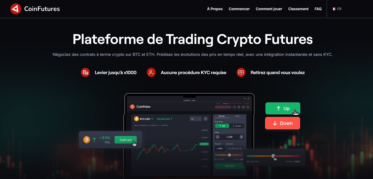| CoinFutures | 1000x | Frais fixes / PnL | Non | Contrats courts avec effet de levier élevé et à durée flexible | Processus de trading ultra-simplifié |