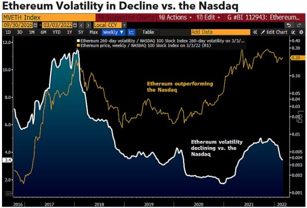 Ethereum’s 260-day volatility has been generally declining vs. the same risk measure of the Nasdaq since peaking at about 11x in 2018. Closer to 3x now, the relative risk of the nascent technology/asset is poised to keep falling, particularly if the war increases recession risks and stock market volatility.