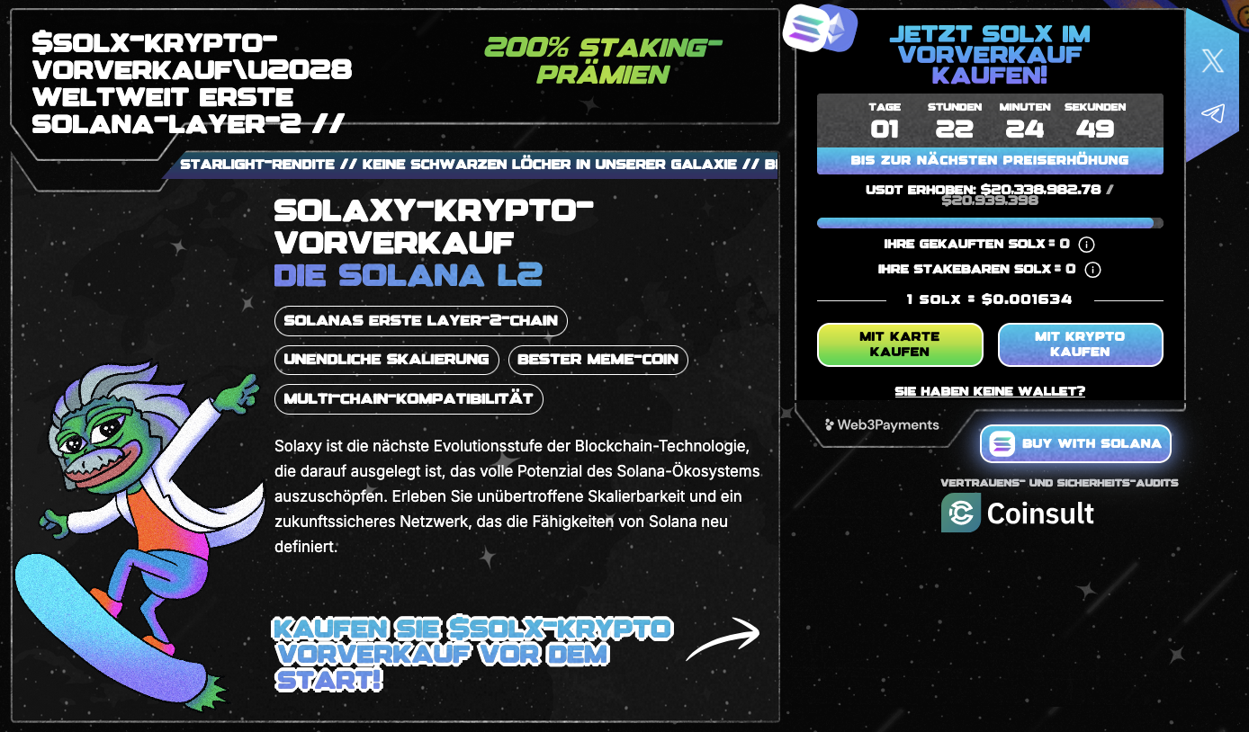 Bisher wurden im Presale bereits über 20 Millionen Dollar investiert, was für einen Vorverkauf eine beachtliche Summe darstellt. Besonders spannend an Solaxy ist jedoch vor allem die Utility, die das Projekt für das Solana-Ökosystem bieten möchte. Es handelt sich um eine der ersten Layer-2-Lösungen für Solana, die darauf abzielt, die Blockchain in Zukunft zu entlasten und bestehende Skalierungsprobleme zu lösen.