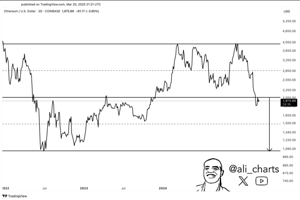 Secondo l’analisi dell’analista, se i rialzisti non dovessero riuscire a mantenere l’asset sopra i 2.050 dollari, il rischio è una discesa verso il supporto a 1.500 dollari, con la possibilità di scivolare ulteriormente fino ai 1.095 dollari.
