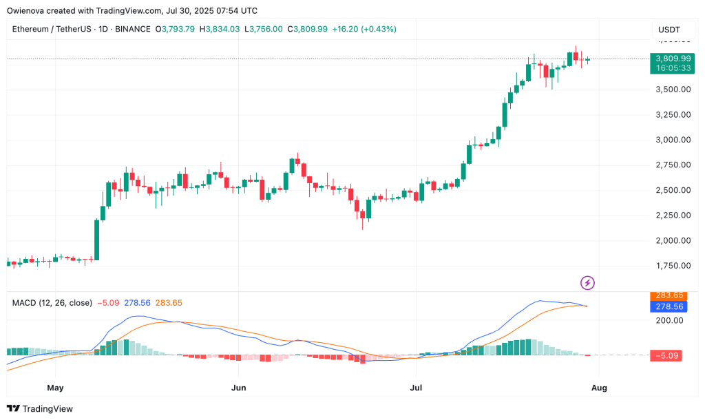Dall’inizio di luglio, Ethereum sta vivendo una fase decisamente rialzista, con un incremento di oltre il 54% nell’ultimo mese. Dopo aver superato livelli chiave di resistenza, la seconda criptovaluta per capitalizzazione sembra aver trovato una certa stabilità sopra i 3.700 dollari.