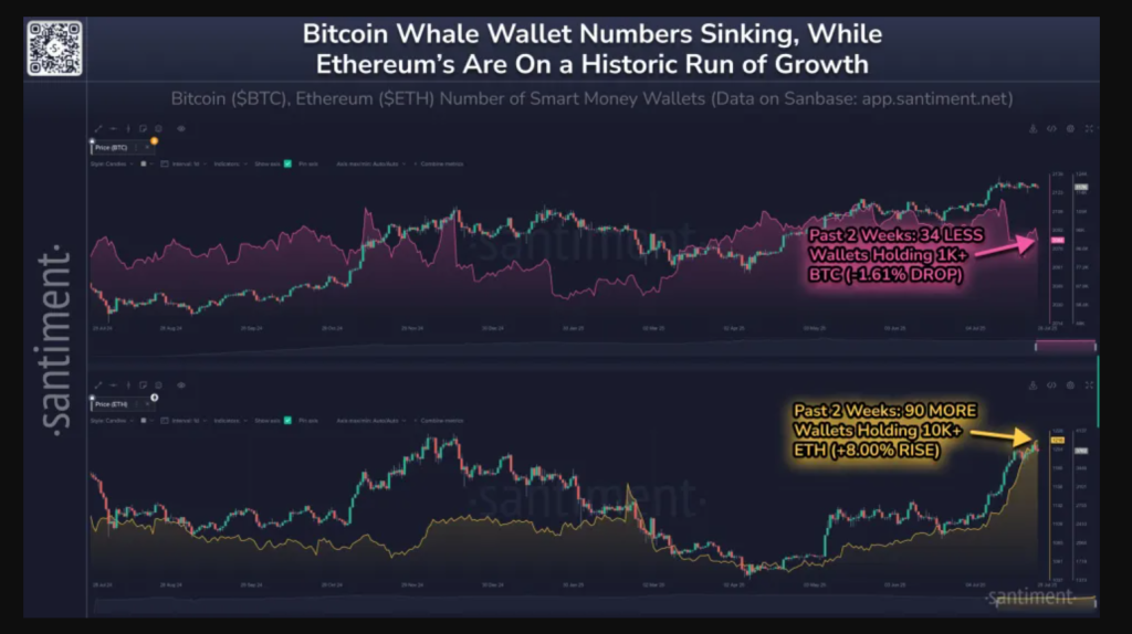 Dalla ricerca di Santiment emerge inoltre un’interessante dinamica: mentre le whale su Ethereum sono in aumento, quelle su Bitcoin risultano in calo. L’analisi, che osserva i comportamenti dei grandi investitori nell’arco di due settimane, evidenzia una possibile rotazione di capitali dai BTC verso ETH.