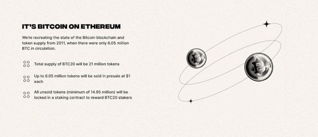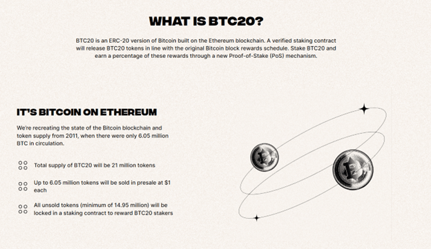 BTC20 (BTC20) positions itself as a fresh iteration of Bitcoin, often referred to as “Bitcoin on Ethereum.” Its name accurately represents its identity as an ERC20 token with a verified staking contract that adheres to the original Bitcoin block rewards schedule, resulting in the issuance of BTC20 tokens. Essentially, BTC20 offers investors the opportunity to acquire the “new Bitcoin” at its lowest price of $1, which was recorded back in 2011.