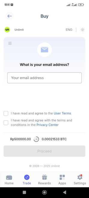 Masukkan jumlah pembelian, pilih mata uang, dan metode pembayaran yang Anda inginkan.