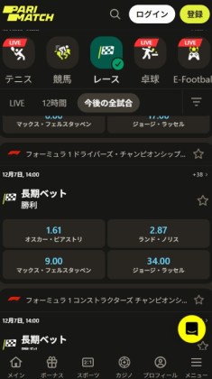 パリマッチは、仮想通貨対応と即時入金で、直前のF1オッズにすぐ賭けられるスピード感が魅力です。ライブベッティングではピットストップ戦略やセーフティカー導入の可能性といった細かいイベントも対象となり、戦略性を楽しみたいプレイヤーに人気です。匿名アカウントで利用できるため、プライバシーを保ちつつ臨場感あるベッティングが可能となっています。
