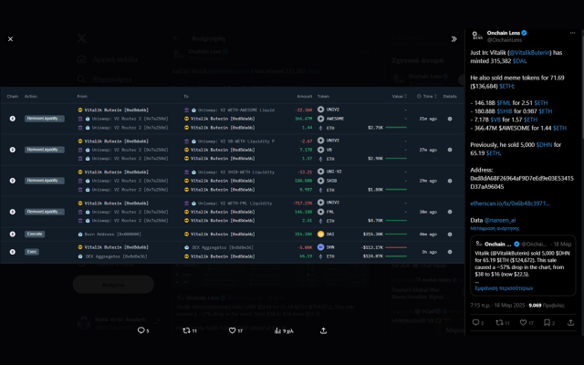 Το φαινόμενο των ψεύτικων meme coins δεν είναι καινούργιο. Ακόμα και προσωπικότητες όπως ο Vitalik Buterin, ιδρυτής του Ethereum, έχουν γίνει στόχος τέτοιων scams. Πρόσφατα κυκλοφόρησε η φήμη πως πούλησε 180 δις Shiba Inu tokens για λιγότερο από 1 ETH, αν και η θεωρητική τους αξία ξεπερνούσε τα 2,3 εκατομμύρια δολάρια. Η πραγματικότητα ήταν διαφορετική, αφού επρόκειτο για ψεύτικα tokens, σχεδιασμένα ώστε να εμφανίζονται στα on-chain δεδομένα σαν να ανήκαν στον ίδιο. Η πρόθεση ήταν να δελεάσουν τους επενδυτές με «fake insider movements».