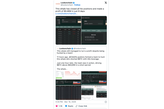 Την Κυριακή, μια φάλαινα του Bitcoin τράβηξε τα βλέμματα των crypto traders μετά την τοποθέτηση μιας short θέσης ύψους $445 εκατομμυρίων σε BTC perpetual futures με μόχλευση 40x – αποκομίζοντας $1,3 εκατομμύρια κέρδη εκείνη τη στιγμή.