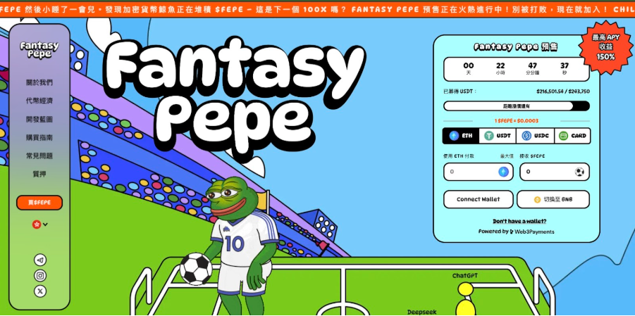 這不只是一個短期炒作項目,而是融合 AI、Web3 和足球文化的長期生態藍圖。如果你相信預測市場與 GameFi 是未來的核心趨勢,Fantasy Pepe 正在你眼前起飛。