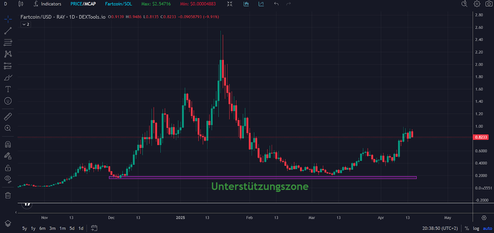 Für einen erneuten Angriff auf das Allzeithoch bei 2,61 US-Dollar fehlen $FARTCOIN aktuell weitere 205 Prozent. Eine Kursbewegung, die der Coin in einem positiven Marktumfeld durchaus schaffen könnte. Aber wie positiv wird besagtes Marktumfeld bleiben? Derzeit kann niemand mit Gewissheit sagen, wie es im schwelenden Zollstreit weitergeht.