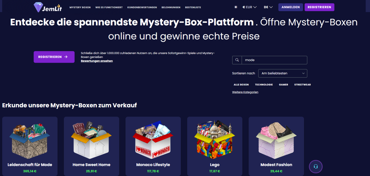 | Jemlit | Riesige Auswahl an verschiedenen Kategorien, viele Fashion Mystery Boxen und eine hohe Transparenz überzeugen. | 50 – 150 Euro | Jemlit.com |