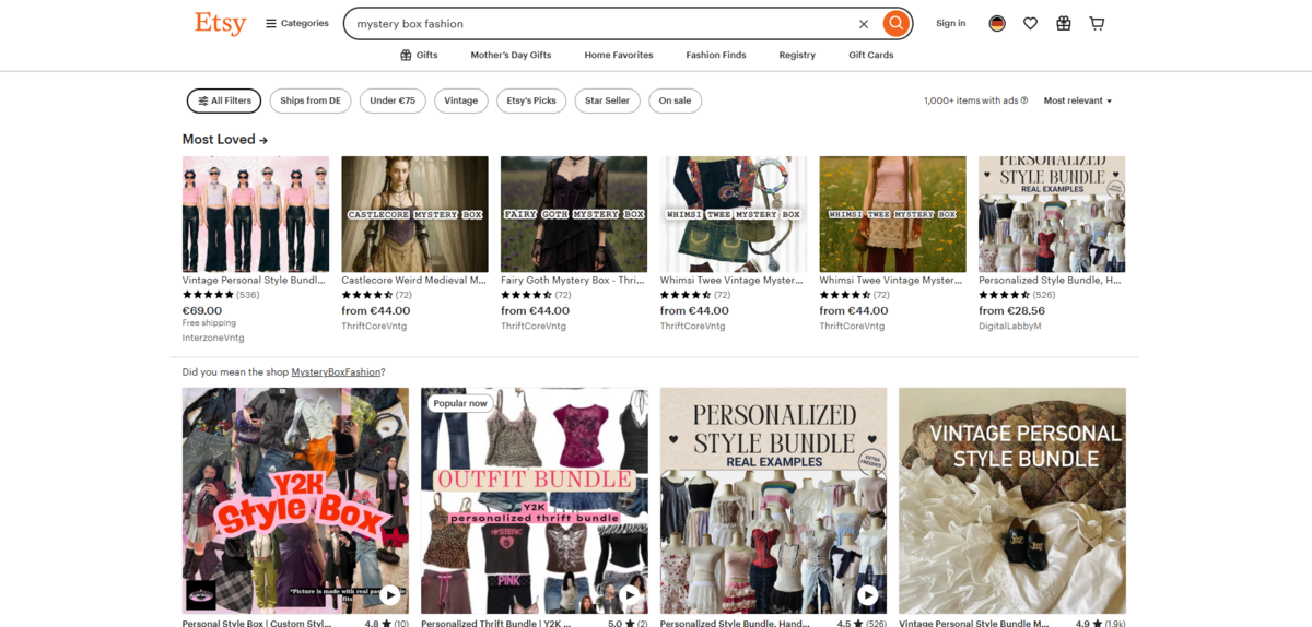 Etsy ist eine der bekanntesten Plattformen für kreative und handgefertigte Produkte, und dieser Fokus zeigt sich auch im Bereich der Fashion Mystery Boxen. Auf Etsy findest du eine breite Auswahl an individuellen und einzigartigen Überraschungsboxen, die von unabhängigen Anbietern angeboten werden. Dies gibt dir die Möglichkeit, exklusive Mode-Artikel zu entdecken, die du in großen Geschäften möglicherweise nicht findest.