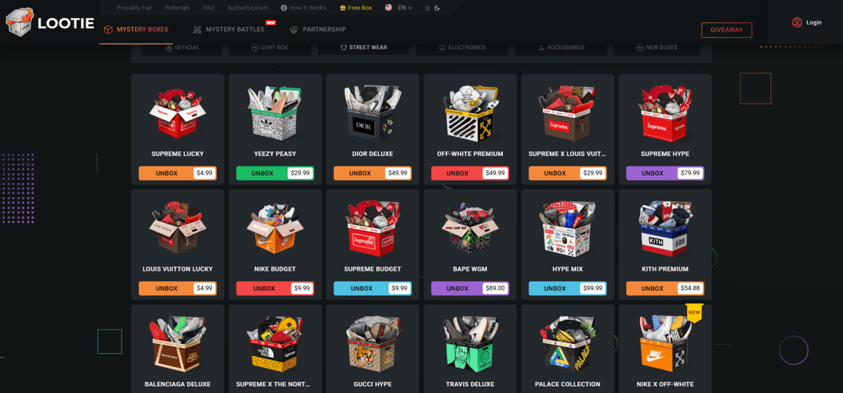 | Lootie | Große Mystery Box Plattform mit Fokus auf Streetwear und Accessoires. | 40 – 200 Euro | Lootie.com |