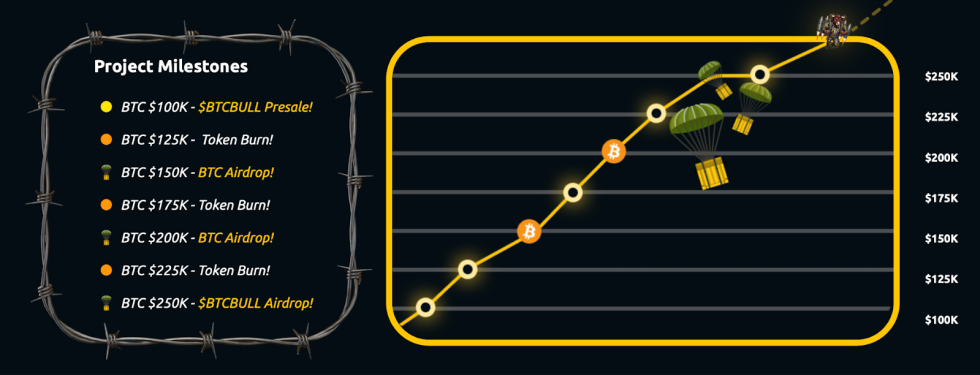 Основната идея е механизъм за пасивен доход в биткойн, наподобяващ добив, но без нужда от скъпо оборудване и сложна поддръжка. Притежателите на $BTCBULL ще получават биткойн еърдропи при достигане на определени ценови нива.