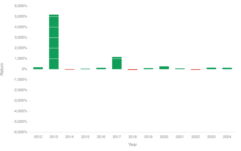 До момента през 2025 г. възвращаемостта на BTC от началото на годината е само 6.27%, но това не изключва нов бичи пробив. През 2017 г. биткойн скочи с 1,162.5%, а дори и по-умерените бичи години като 2023 и 2024 донесоха съответно 146% и 135% – далеч над сегашното темпо.