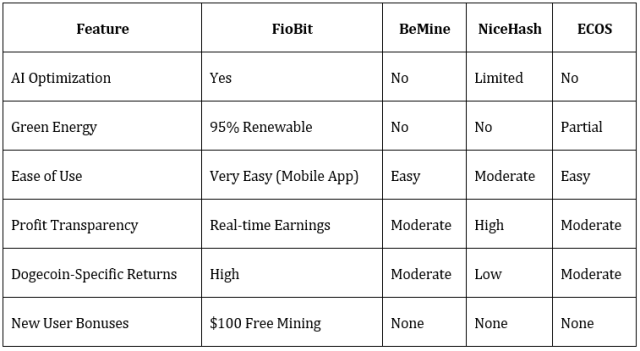 In-Depth Comparison Table: FioBit vs. Key Dogecoin Cloud Mining Competitors