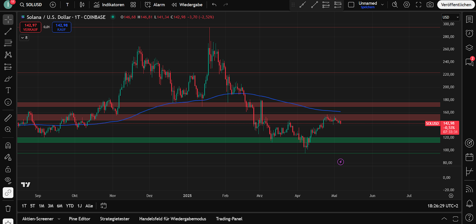 (Der Kurs von Solana hat seine beiden wichtigsten Supportzonen gehalten und notiert jetzt knapp unter dem EMA 200 – Quelle: Tradingview.com)