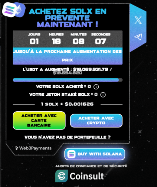 Au vu des performances sur Solana, il paraît essentiel de se pencher sur ce que pourrait apporter $SOLX lors de son lancement. Actuellement en prévente avec près de 20 millions de dollars de fonds ayant été levés, cela démontre l’appétit des investisseurs à l’égard de cet actif en amont d’un listing sur des plateformes d’échange crypto.