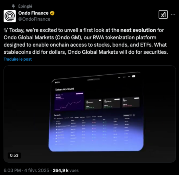 Le 4 février, Ondo Finance a dévoilé l’évolution du Ondo Global Markets avec la tokenisation on-chain d’actifs TradFi (actions, ETFs et bien plus encore).
