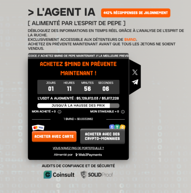 Concrètement, nous sommes sur un projet “AAA” qui vise à concurrencer les acteurs d’ores et déjà établis. Dans ce cadre, qu’attendez-vous pour découvrir MIND of Pepe, venant de dépasser les 5 millions de dollars ? Avec un $MIND au prix de 0,00032662 dollar par jeton, la prochaine hausse du cours est imminente.