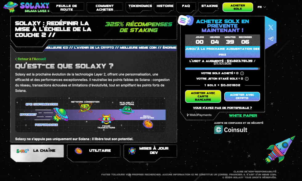 Actuellement, un $SOLX est à 0,001602 dollar. Il ne reste donc plus que quelques heures pour s’exposer au projet et être en bénéfice, avant même le listing du projet au grand public. N’attendez plus et mettez un pied dans cette prévente de Solaxy.