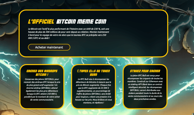 Pour la toute première fois, découvrez une prévente orientée vers l’écosystème du roi des cryptomonnaies. Bitcoin Bull avec le jeton $BTCBULL, c’est l’assurance de gagner gros avec la hausse de $BTC. D’ores et déjà couvert par de nombreux médias, avoir du $BTCBULL permet à chaque palier majeur de bitcoin d’obtenir un airdrop en $BTC.