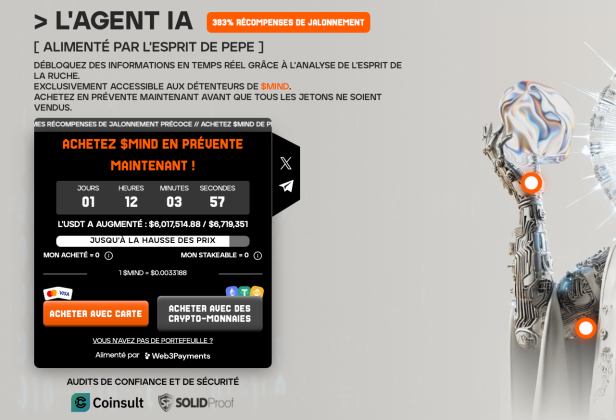 Pour conclure sur cette liste des cryptos à acheter pendant le pump des memecoins, c’est un jeton hybride, croisant à la fois la narrative de l’IA avec les memecoins. Découvrez MIND of Pepe, le tout premier Pepe agent IA. Avec un jeton au coeur de l’écosystème, le $MIND, c’est l’opportunité de se placer sur un panier de narratives différentes.