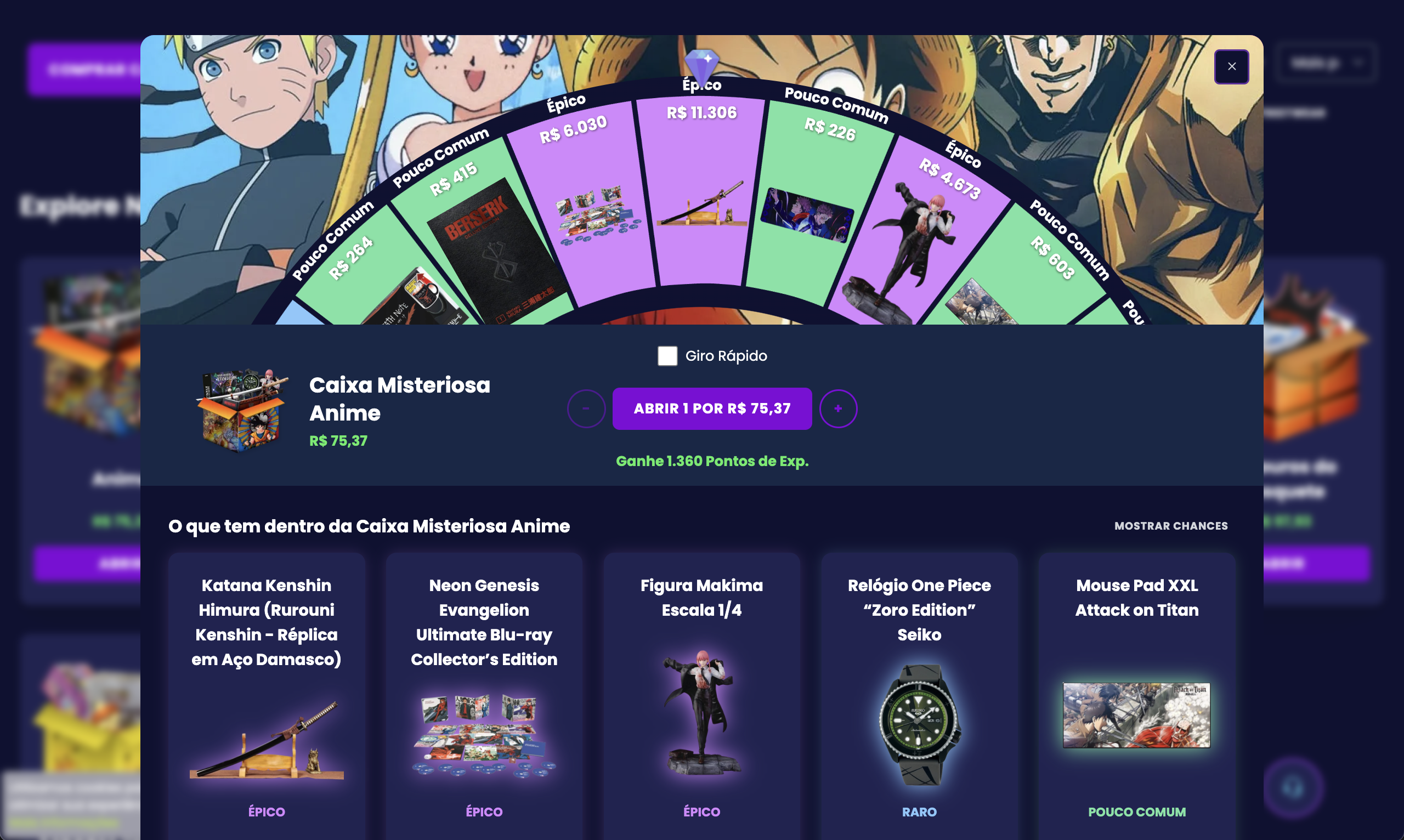 O JemLit oferece caixas específicas para o universo Funko, cada uma recheada de itens que podem ir de modelos comuns até peças extremamente raras, muitas delas edições de eventos internacionais ou créditos para novas tentativas. O mais interessante é que você pode conferir todas as opções e as probabilidades de cada item antes de abrir a caixa, garantindo transparência e aumentando a emoção na hora de girar a roleta.
