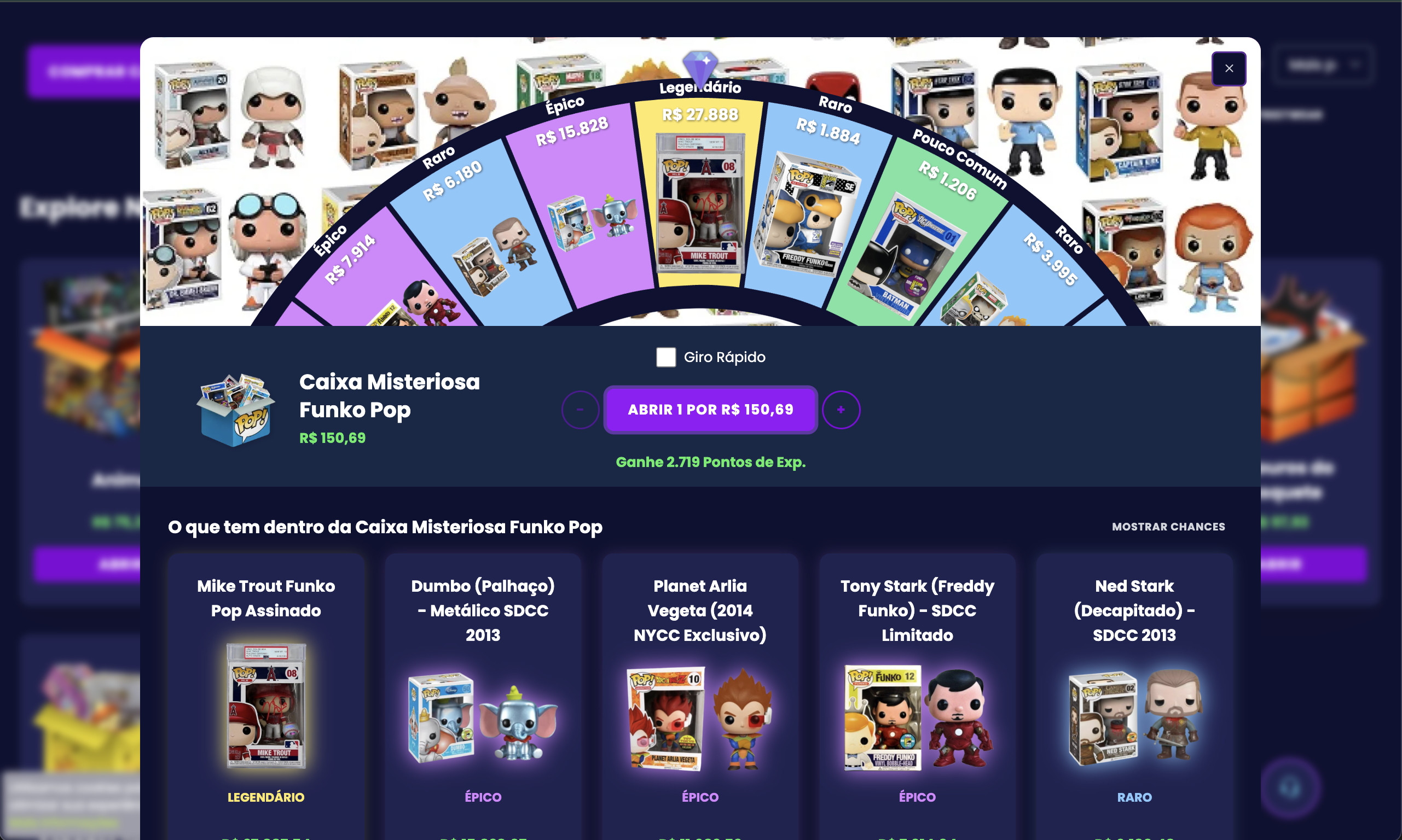 Em vez de depender de revendas caras ou sorteios demorados, basta escolher uma caixa surpresa Funko Pop, conferir as chances e abrir. O resultado aparece na hora, e você sempre leva algo para casa — seja o Funko dos seus sonhos até o Funko pop mais barato do mundo comparado aos preços tradicionais.