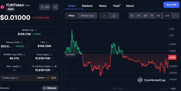 In the days that followed, momentum continued to build. Subsequent buying pressure and ecosystem optimism propelled FUNToken into the $0.010–$0.011 price range, with market capitalization climbing to approximately $119 million. This marked a significant milestone for a project that only months earlier was considered a niche gaming token.