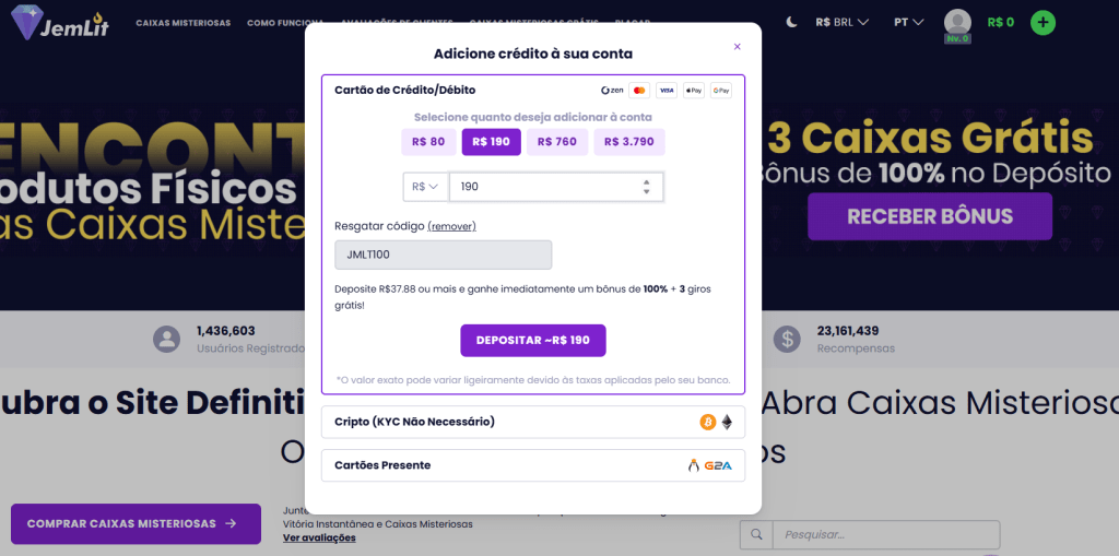 2. Faça seu primeiro depósito via Pix, cartão de crédito, ou até criptomoedas. Ao usar o código “JMLT100” neste primeiro depósito você ganhar um bônus incrível: 100% sobre o primeiro depósito e mais 3 caixas grátis.