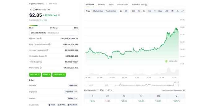 W momencie pisania tego tekstu token Ripple kosztuje 2,85 USD. Zalicza wzrost o 32% i szybko zbliża się do psychologicznej granicy 3 dolarów.