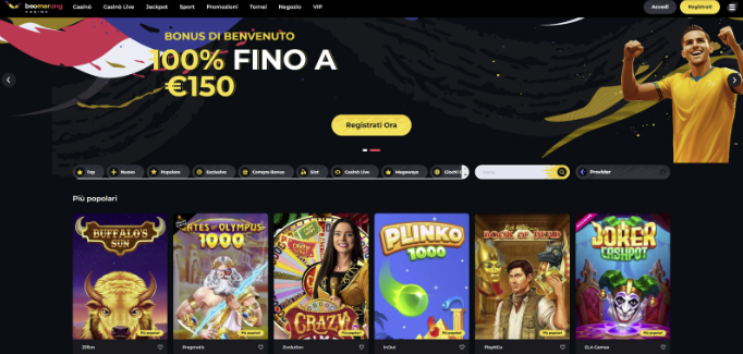 - Boomerang Casino: catalogo con oltre 5.000 giochi. Prelievi più lenti. Bonus del 100% fino a €500 con 200 giri gratuiti.