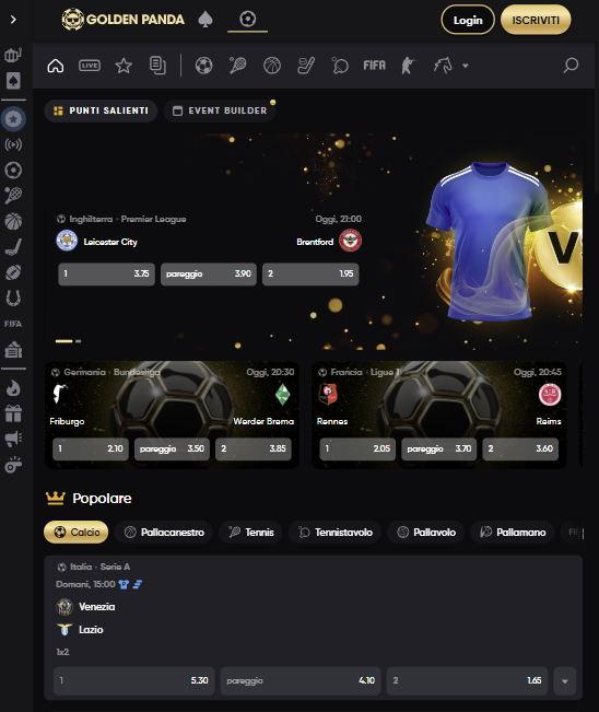 Ami lo sport e le scommesse? Golden Panda ha pensato anche a te. Ti basterà entrare nella sezione sportsbook per scoprire una ricca selezione di eventi. Qui puoi puntare su sport come calcio, basket, baseball e corse di cavalli. Disponibili anche scommesse in-play e pre-match, supportate da quote competitive e da strumenti statistici che aiutano a pianificare le puntate.