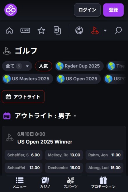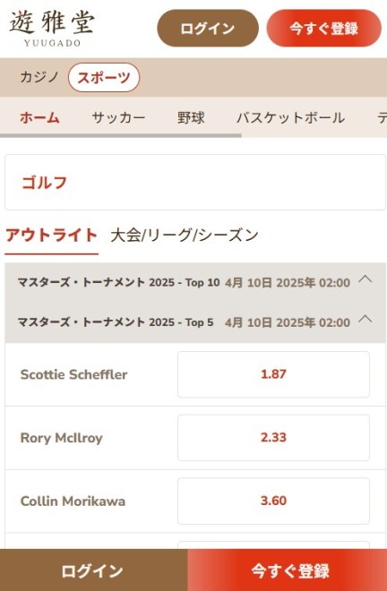 遊雅堂カジノは、長年の運営実績による安定感で信頼を得ており、ゴルフベットにおいても強みを発揮しています。PGAツアーや欧州ツアーはもちろん、日本選手が出場する大会のオッズも豊富に揃っています。特にライブベット機能が優れており、ラウンド中のショットごとの流れを読みながらリアルタイムで賭けられる点がおすすめです。加えて、仮想通貨対応で資金移動が速く、試合当日に資金を用意して即ベットできる利便性も魅力となっています。