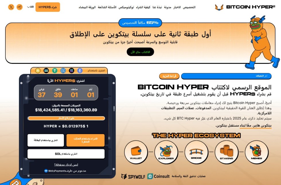 - Bitcoin Hyper (HYPER): مشروع تقني يستهدف تطوير البنية التحتية لشبكة البيتكوين عبر تقنية الطبقة الثانية (L2)، لجعل المعاملات عليها سريعة ومنخفضة التكلفة دون الاعتماد على آليات ربوية.