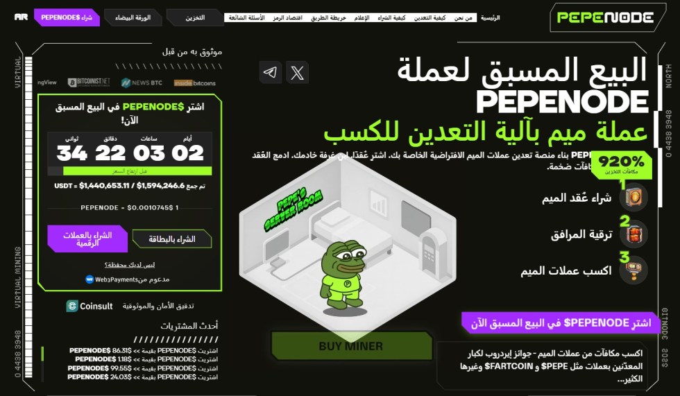 - Pepe Node (PEPENODE): مشروع يعتمد نموذج “شارك لتكسب”، حيث يتيح للمستخدمين المشاركة في بناء منظومة تعدين افتراضية مقابل مكافآت تعتمد على الجهد والنشاط.