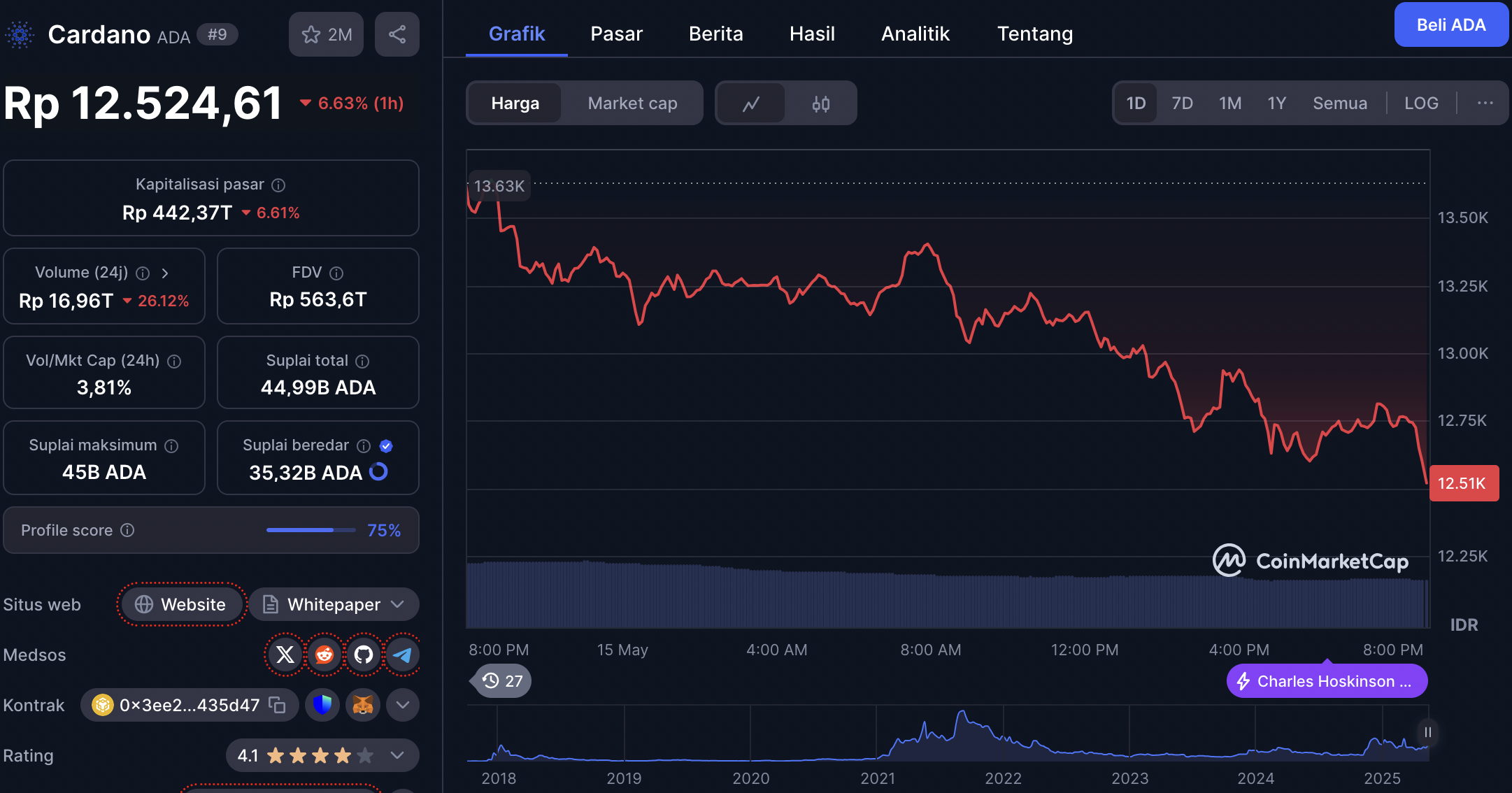 Harga terkini ADA tercatat di angka $0.7757 atau sekitar Rp12.812, turun 6,12% dalam 24 jam. Secara teknikal, ADA gagal melampaui resistance di $0.7830 (Rp12.936), namun kekuatan fundamental proyek tetap terjaga. Dengan arsitektur berlapis yang mendukung skalabilitas dan efisiensi kontrak pintar, Cardano mampu menghadirkan solusi yang siap untuk adopsi massal.