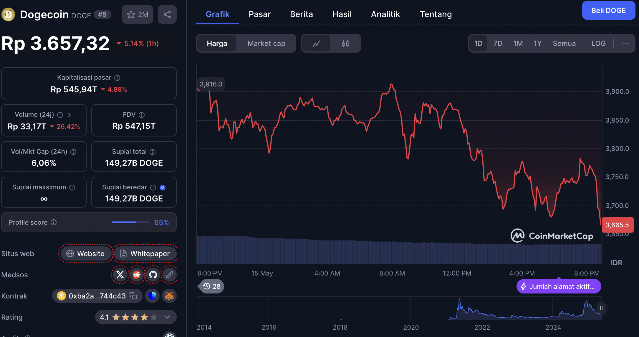 Dogecoin tetap menjadi simbol utama dalam kategori meme coin, didukung oleh komunitas besar serta rekam jejak panjang sebagai aset kripto favorit investor ritel. Popularitasnya melonjak tajam berkat dukungan Elon Musk di masa lalu, dan kini DOGE kembali menarik perhatian berkat lonjakan aktivitas on-chain yang signifikan.