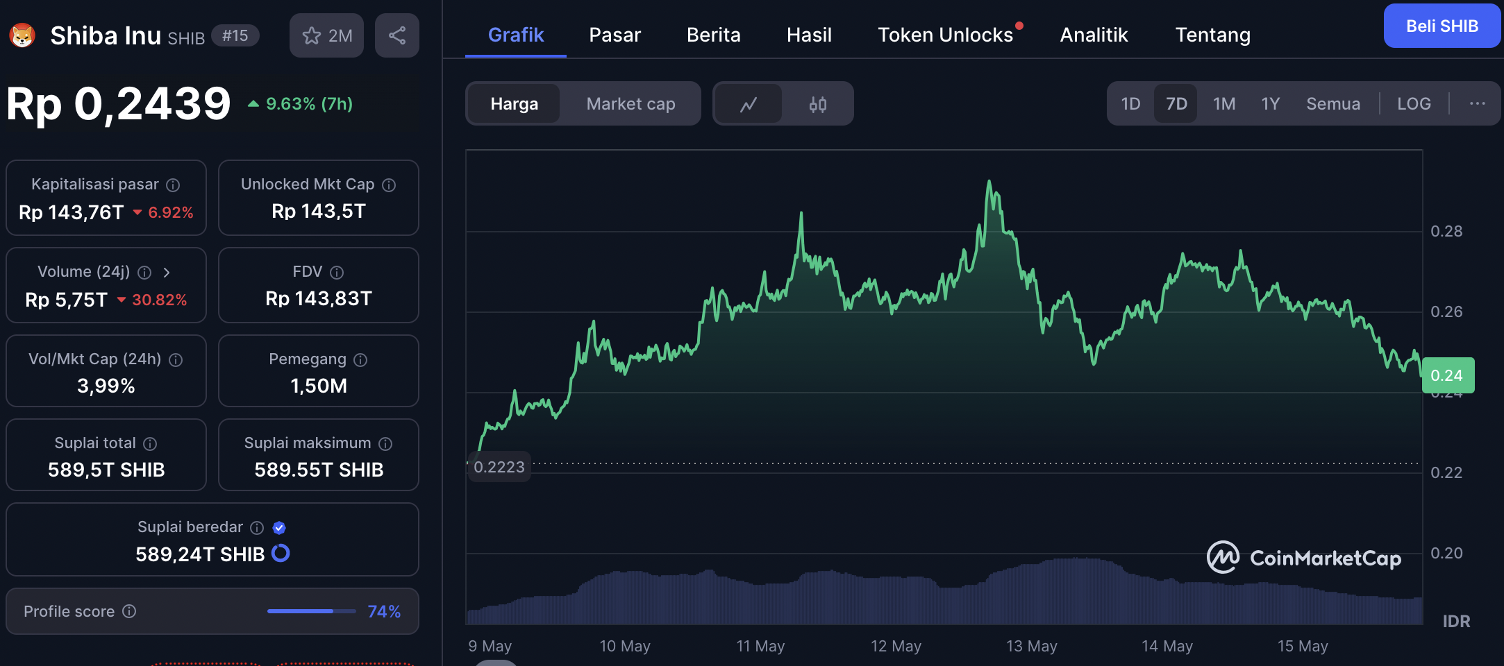 Harga SHIB saat ini berada di $0.00001508 atau sekitar Rp0,249, turun sebesar 5,62% dalam sehari. Penurunan ini cukup signifikan mengingat jumlah suplai token yang sangat besar, yakni 589 triliun. Meski begitu, volume transaksi yang tercatat di atas $350 juta (Rp5,7 triliun) menandakan bahwa aktivitas perdagangan tetap tinggi.