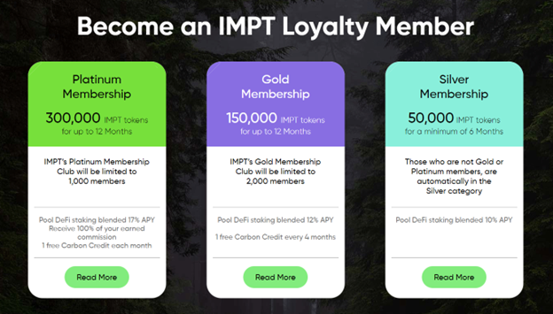The IMPT loyalty member staking programme is worth diving into in more detail. There are three tiers of memberships – Silver, Gold, and Platinum. Respectively, they require 50,000 IMPT tokens for a minimum of 6 months; 150,000 IMPT tokens for up to 12 months; and 300,000 IMPT tokens for up to 12 months. The Gold membership is limited 2,000 members and the Platinum membership is limited to 1,000 members.