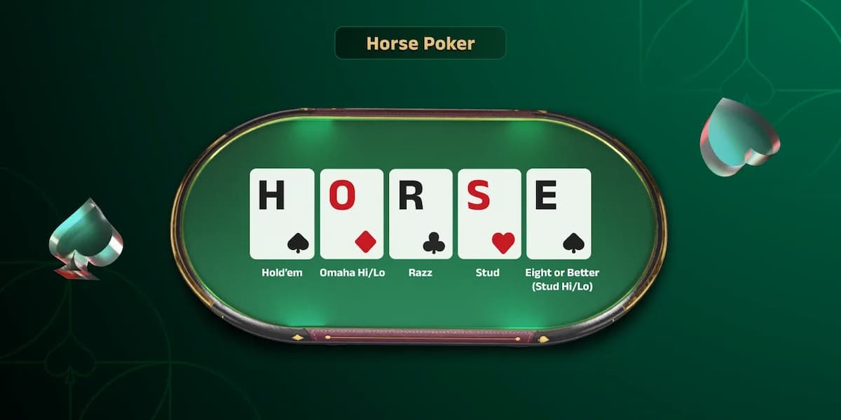 Như đã nói, Poker Horse là phiên bản Poker đặc biệt, bao gồm tổng hợp 5 biến thể Poker diễn ra lần lượt là:
