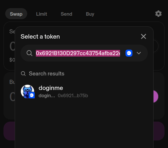 - Go to a DEX like Uniswap on the Base network and paste $DOGINME’s contract address.