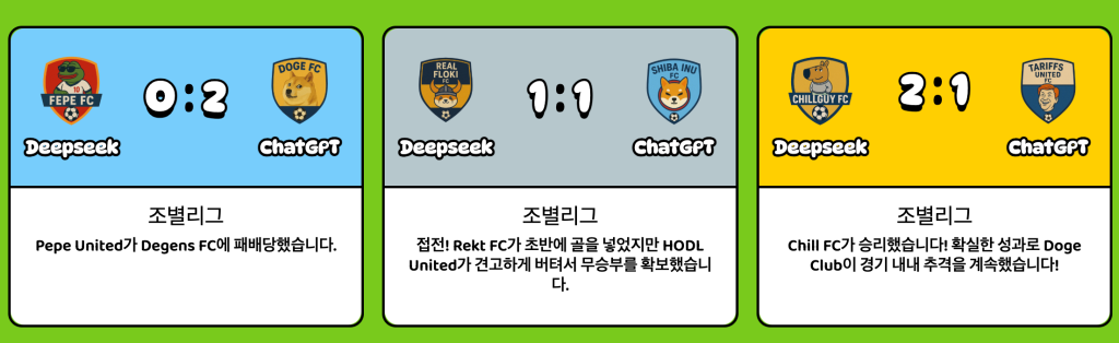- AI 기술을 결합한 판타지 축구 게임: 판타지 페페는 AI 기반으로 구동하는 판타지 축구 플랫폼입니다. 이용자는 경기에서 어느 팀이 승리하고, 몇 번의 골을 기록하는지 등의 결과를 예측할 수 있습니다. 챗지피티, 딥시크 같은 AI 모델이 60초 간 경기를 진행하고 텍스트 기반으로 중계 방송이 나와 재미있게 축구 경기를 예측하는 경험이 가능합니다.