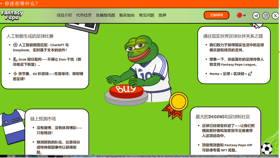 對於想參與新一代迷因革命的投資者、足球愛好者、NFT 收藏玩家來說,FEPE 提供的不只是價格增值的可能性,更是創造、參與、贏得榮耀的舞台。這不再是單向的炒幣遊戲,而是一場共建未來的虛擬聯賽。當比賽開始的哨聲響起,FEPE 已經在區塊鏈的綠茵場上踢出第一球。你,要上場了嗎?