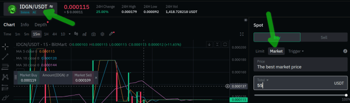 Find the spot trading section under Trade > Spot (top left corner). Select IDGN/USDT as your pair and click the ‘Market’ option under the buying menu.