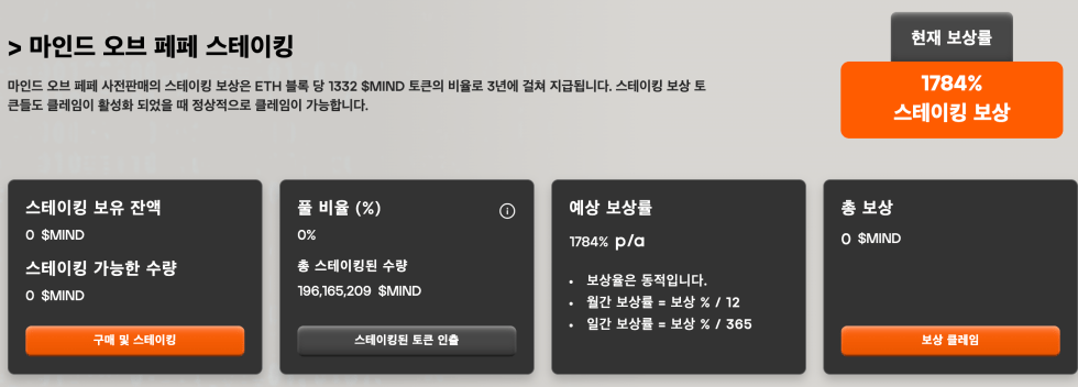 이제 구매한 토큰을 마인드오브페페 웹사이트의 스테이킹 풀에 예치할 수 있으며 남은 ICO 기간 동안 추가 토큰을 모을 수 있습니다. 마인드오브페페는 프리세일을 시작한 지 얼마되지 않았기 때문에 아직 스테이킹 보상률이 APY 1,799%로 매우 높습니다. 홈페이지 ‘스테이킹’ 페이지로 이동하면 스테이킹할 $MIND 수량을 선택하여 예치할 수 있습니다.