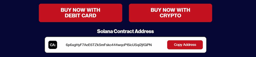 Bạn có thể mua meme coin $TRUMP trực tiếp thông qua trang web chính thức GetTrumpMemes. Trang web cung cấp cho nhà đầu tư Địa chỉ hợp đồng Solana của token $TRUMP, cùng các tùy chọn trực tiếp để mua $TRUMP thông qua thẻ ghi nợ hoặc tiền điện tử.