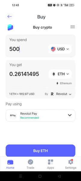 To buy directly with fiat, open your wallet, find the ‘Buy’ button on your dashboard, and select the cryptocurrency to purchase. Next, type in how much to buy and add your payment details to confirm your transactions.